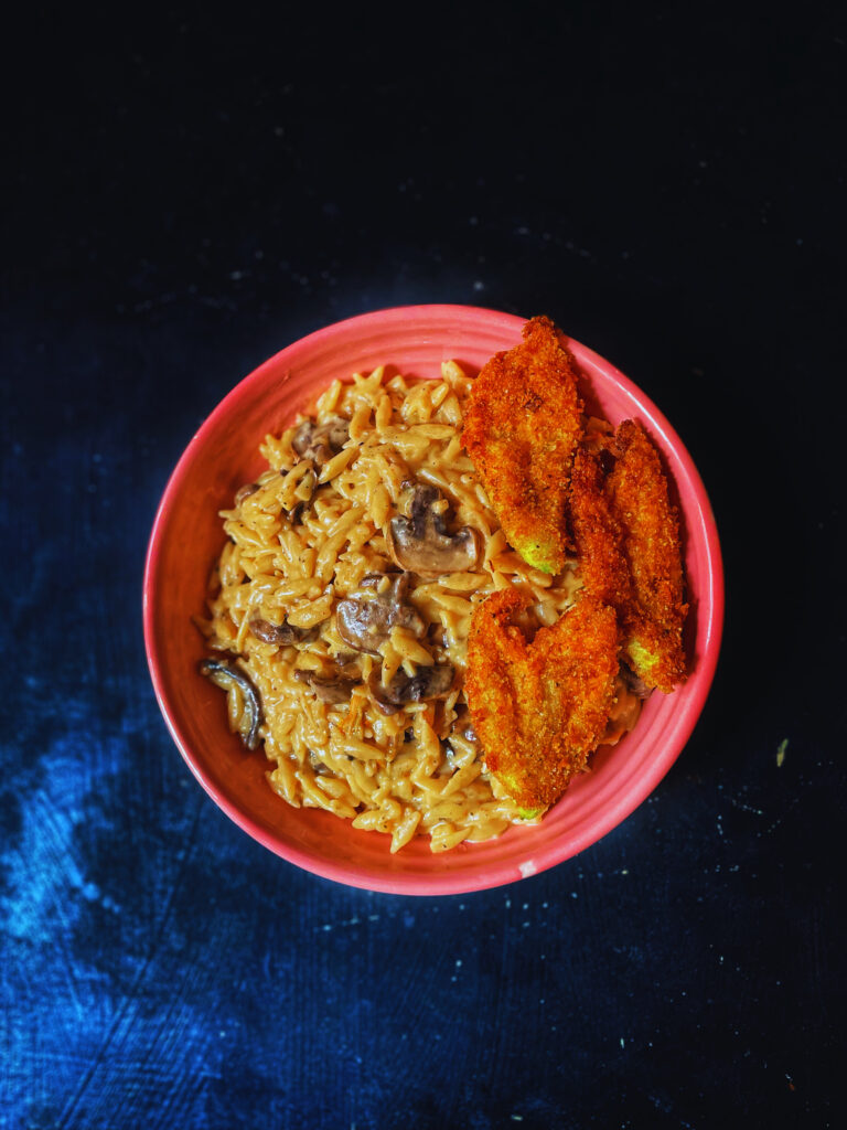 By combining orzo with pumpkin flower and mushrooms, you create a dish that’s not just flavourful but also a bit unexpected. The orzo cooks directly in the sauce and aromatics, absorbing every layer of flavour as it simmers. Onions, garlic and herbs, butter and a good grating of parmesan tie everything together in a creamy, comforting base.