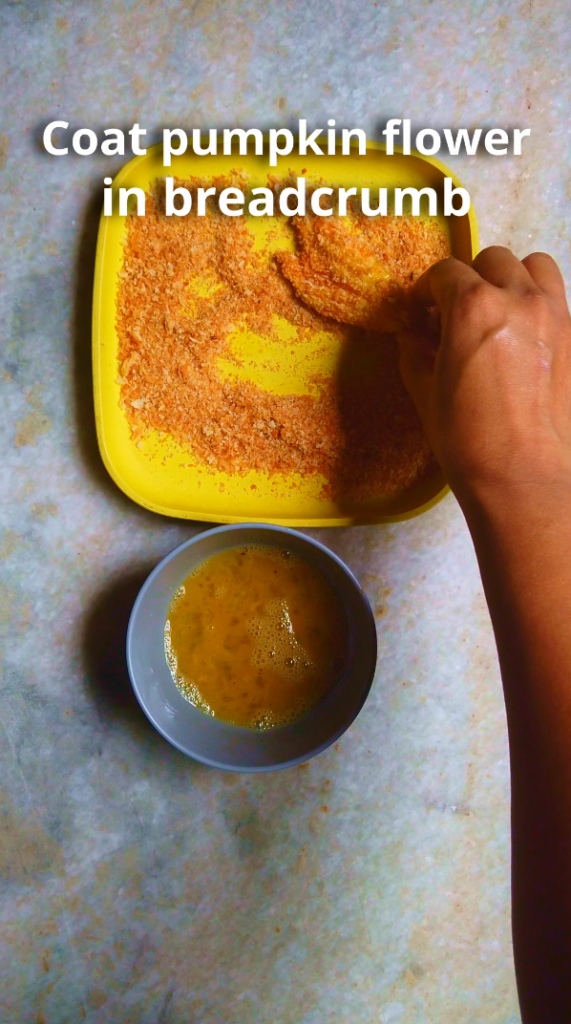 - Step 9: Dip the pumpkin flower in the beaten egg and then coat in breadcrumb. Set aside.