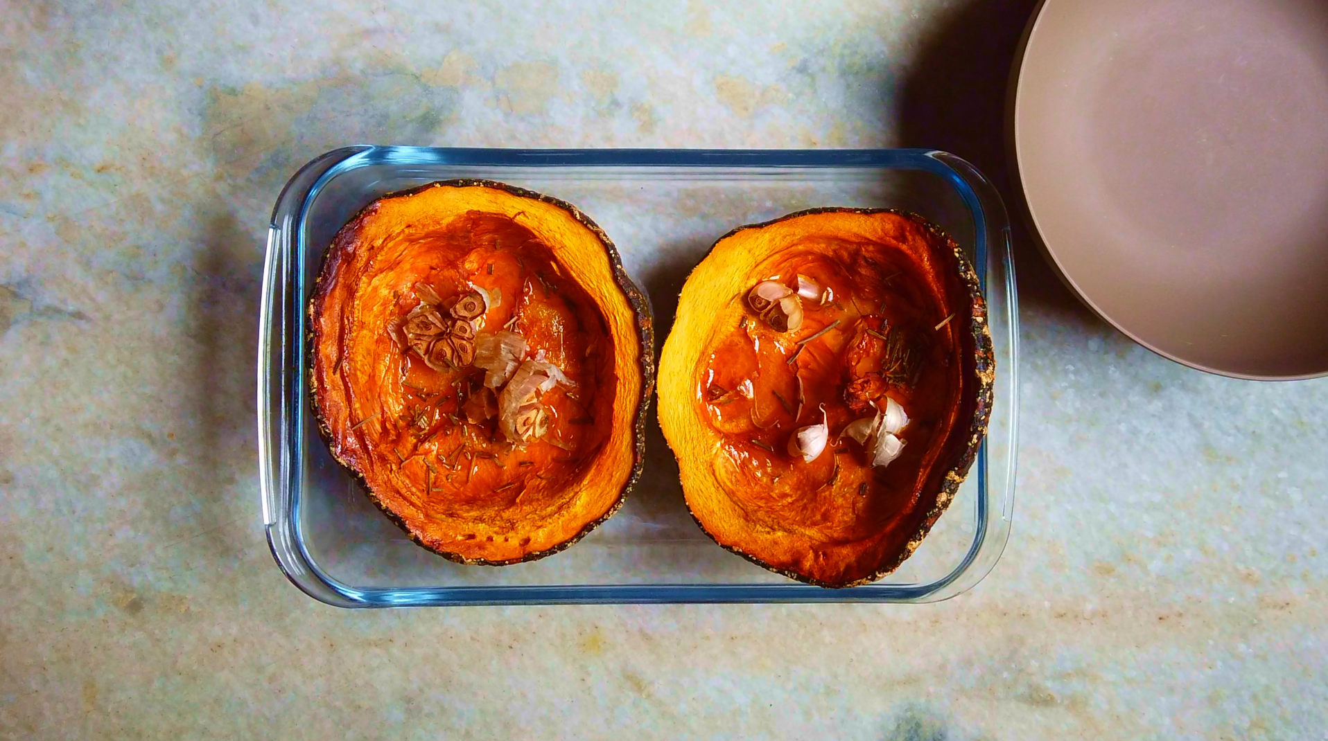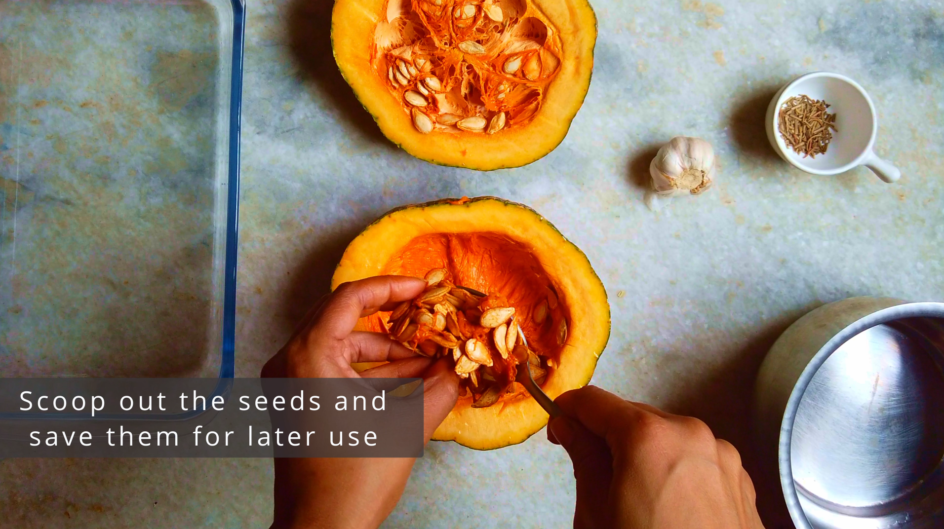 - Step 1: Preheat oven to 220°C. Carefully halve the pumpkin and scoop out the seeds and save them for later use. Slice a whole garlic head in half and place in the baking tray.