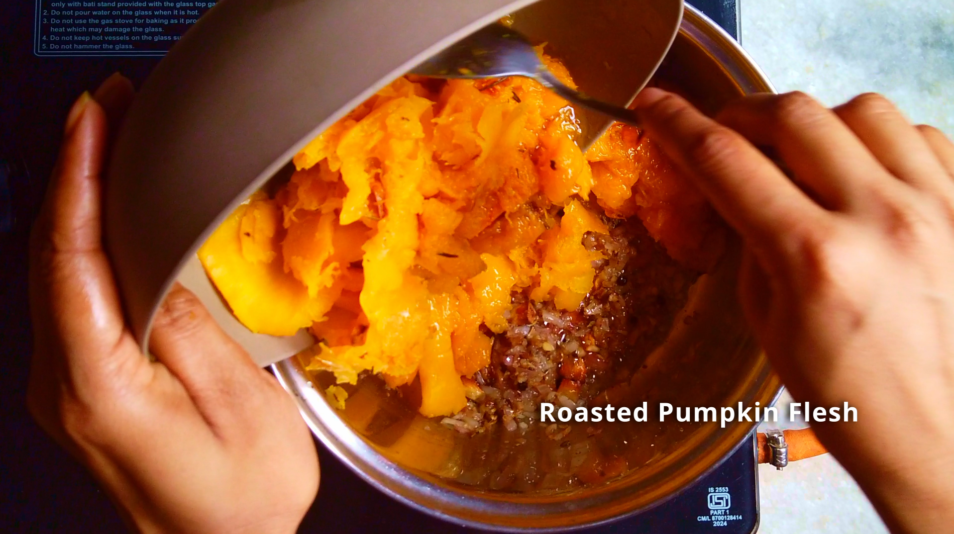 - Step 11: Add the pumpkin flesh, sauté for few minutes. Add the stock, salt to taste, stir to combine.