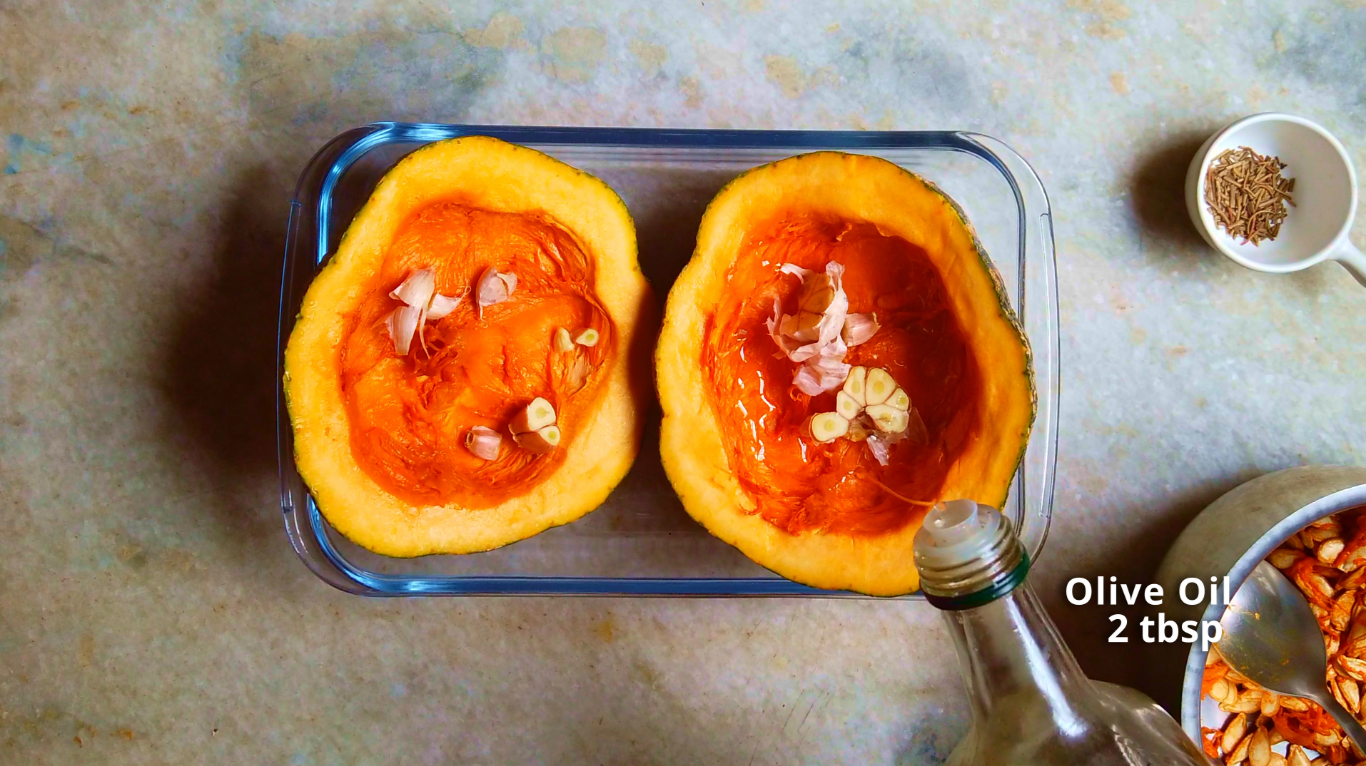 - Step 2: Drizzle the pumpkin with olive oil and dried rosemary.