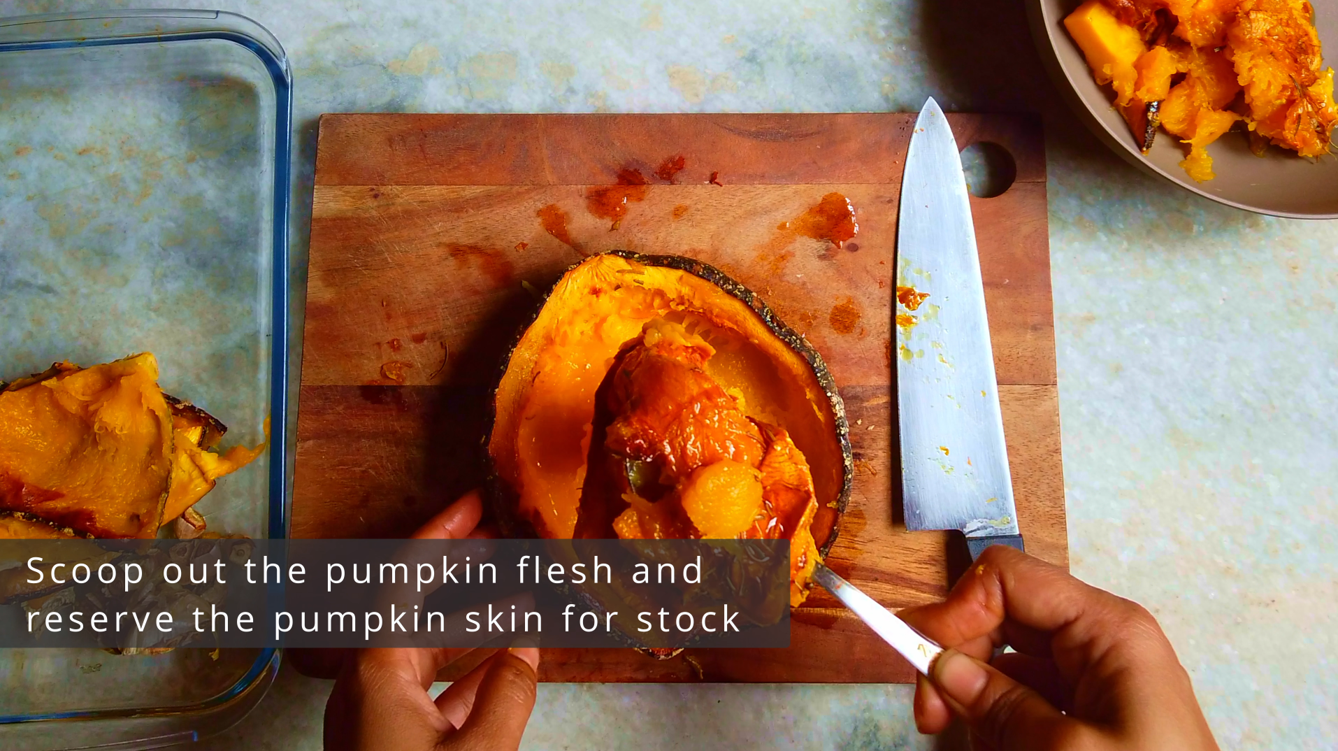 - Step 4: Then scoop out the pumpkin flesh and reserve the pumpkin skin.