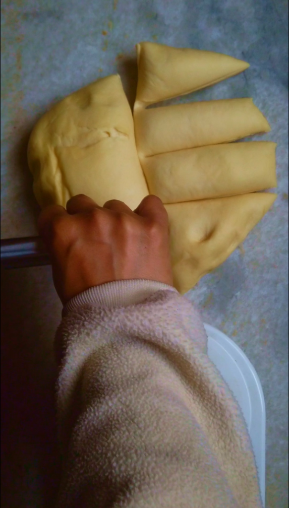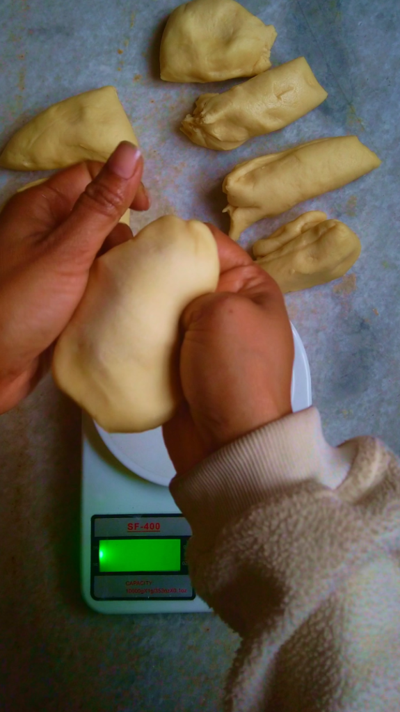 - Step 5: After the first rise, gently punch down the dough and divide it into equal 8 equal portions. Hold each piece of dough, gathering the seams together and pinching them at the bottom. Place the ball on palm of your hand, creating tension in the dough. With a loose grip, roll the dough back and forth against palm of your hand, forming a tight, smooth circle without overdoing it to avoid tearing.