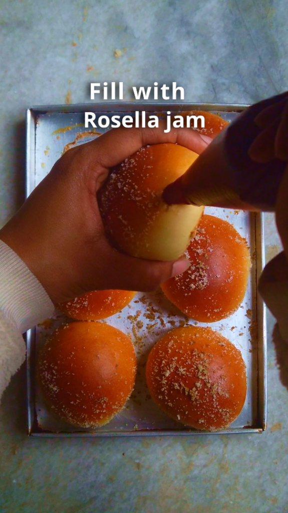 - Step 9: Fill a piping bag with Rosella Jam. Set the doughnuts on their sides and poke a hole in the side of each with a chopstick or skewer. Insert the tip of the piping bag and fill each doughnut with the Rosella jam. You’ll know you’ve filled them enough when they start expanding.