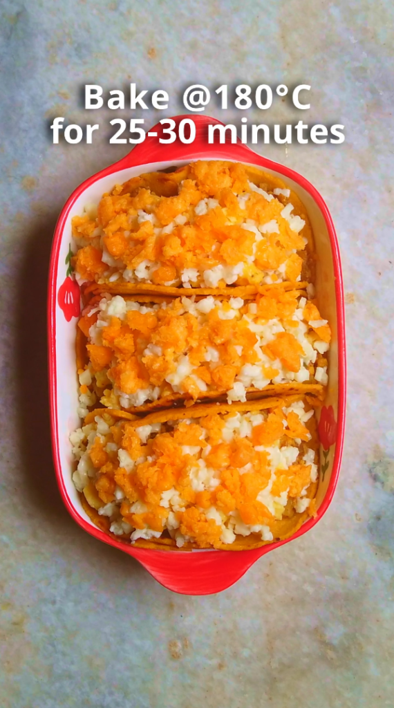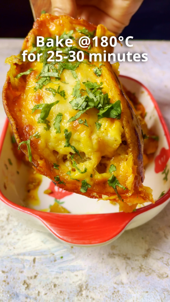 - Step 7: Preheat the oven @180°C. Bake the tacos for 25-30 minutes.