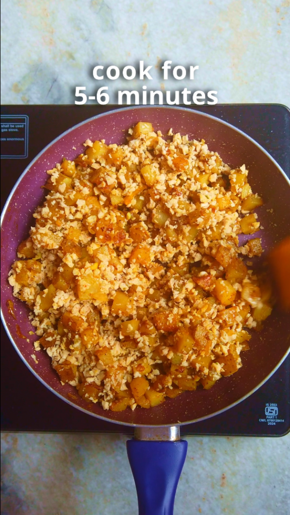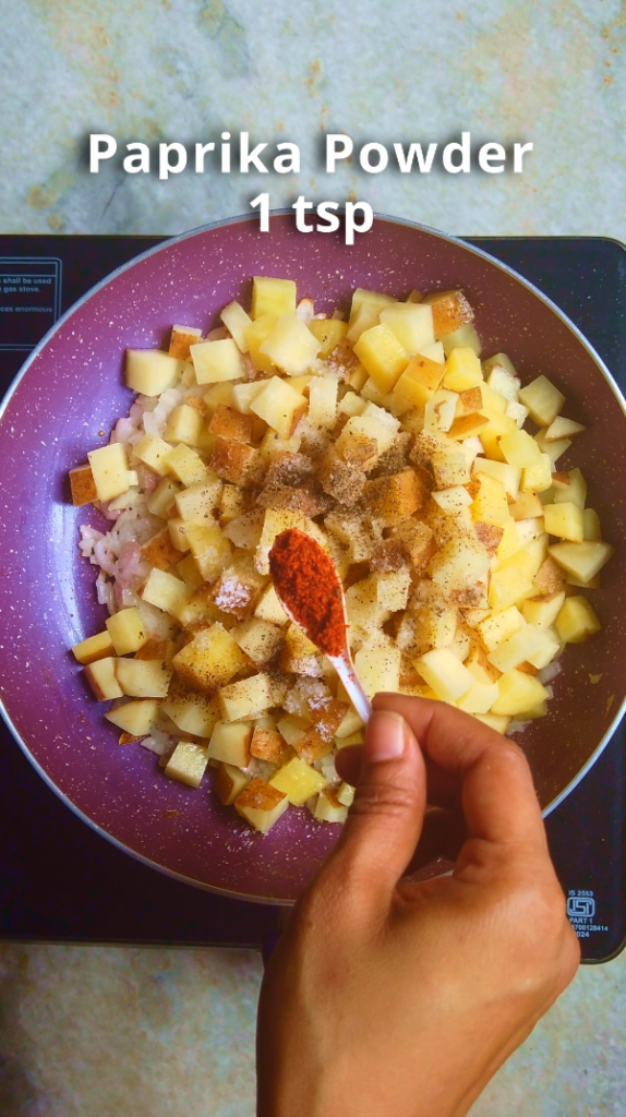 - Step 2: Then add diced potatoes, salt, pepper and paprika and stir to combine. Cover and cook the potatoes for 10-15 minutes on low heat or until the potatoes are cooked through.