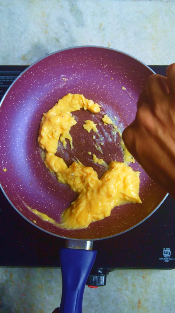 - Step 5: Heat a pan with butter on low heat. Then add in the egg mixture and start mixing continuously, remember to be gentle and bring the eggs from the outside to the inside, about 6 minutes after adding the eggs, they should be really creamy but have texture to them and be fully cooked through. Remove the pan from the heat.