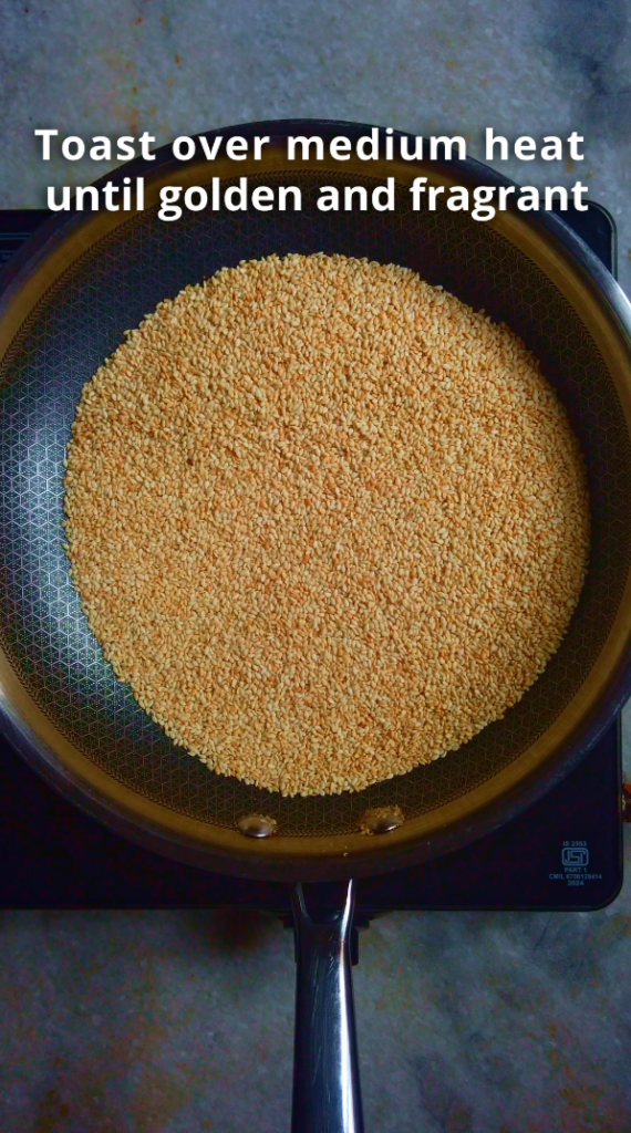 • Step 1: Toast sesame seeds in a dry pan over medium heat until golden and fragrant.
